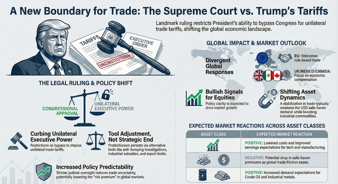 When the U.S. Supreme Court issues a "unconstitutional" ruling on the Trump administration’s large-scale tariff policies, it is more than just a legal milestone. It is a massive policy shock that forces global capital markets to re-evaluate the "uncertainty premium." Trade policy has never been about simple tax figures; it is the core variable driving global supply chain structures, USD liquidity paths, corporate profit margins, and inflation transmission mechanisms.